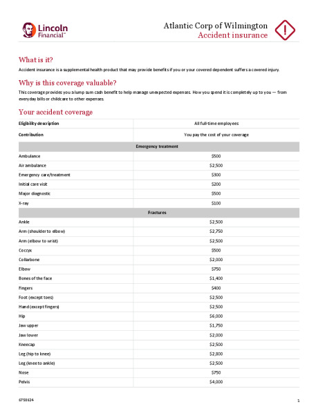 Accident insurance pays you benefits for specific injuries and events resulting from a covered accident that occurs on or after your effective date. The benefit amount depends on the type of injury and care received.