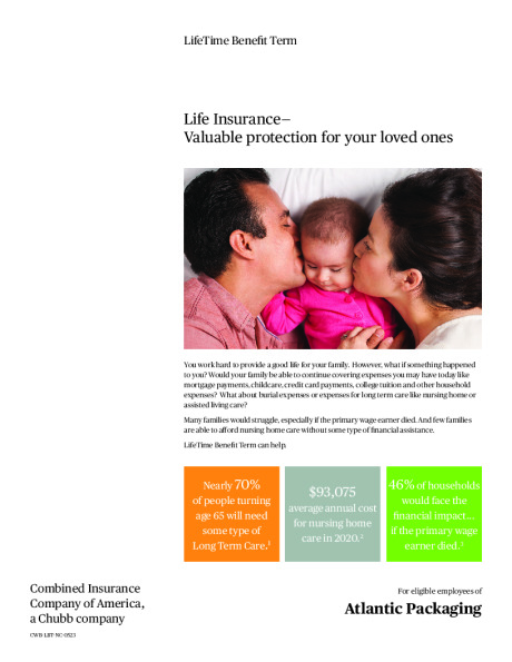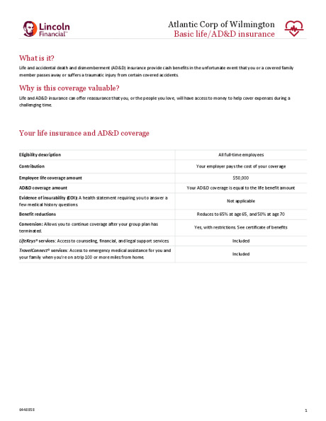 Atlantic Packaging provides Basic Life and AD&D benefits to eligible employees at no cost to the employee. The life insurance benefit will be paid to your designated beneficiary in the event of death while covered under the plan. The AD&D benefit will be paid in the event of a loss of life or limb by accident while covered under the plan.ย