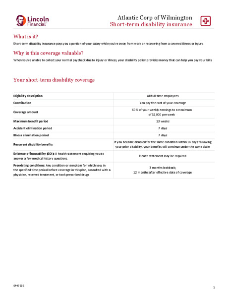This benefit covers 60% of your weekly base salary up to $2,000/week. The benefit begins after 7 days of injury or illness and lasts up to 12 weeks. Please see the summary plan description for complete plan details.